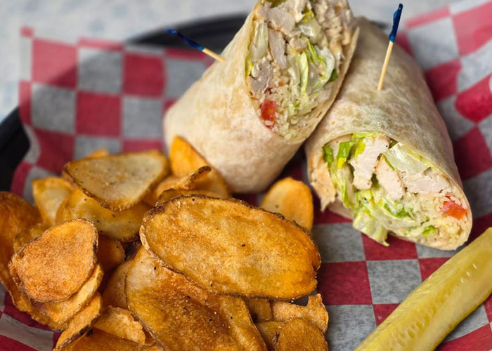 Chicken Caesar Wrap: Chicken | Parmesan Cheese | Lettuce | Tomatoes | Caesar Dressing | Homemade chips on the Side