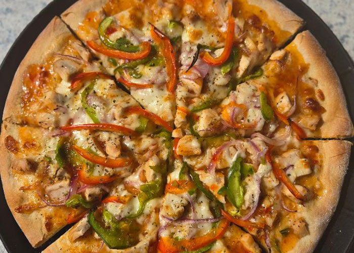 Sweet Chili Chicken Pizza: Chicken | Mozzarella Cheese | Red onion | Green pepper | Red pepper| Drizzle with Sweet Chili Sauce
