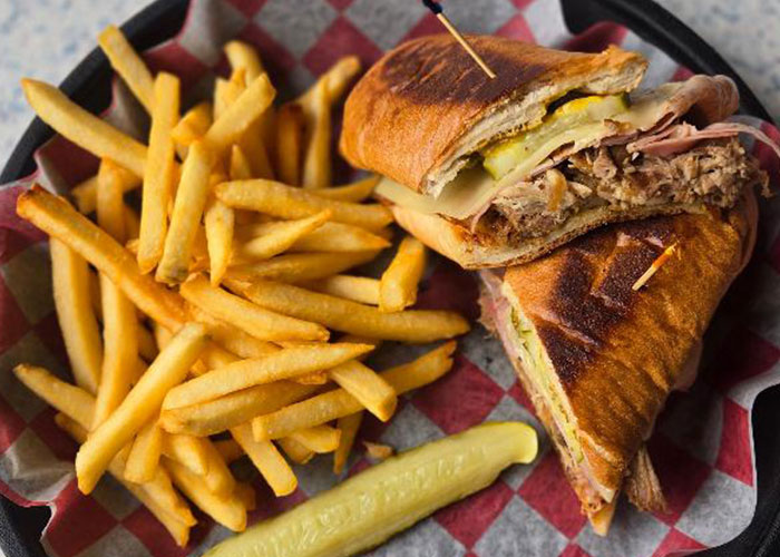 Cuban Sandwich: Ham, Carnitas, Swiss cheese, pickles, and spicy mustard pressed to golden glory